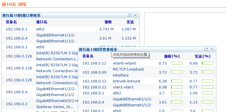 OpManager允许用户自行设计仪表板中窗口部件的摆放次序,用户只需通过鼠标点击并拖拽便可以拖动窗口部件到其适合的位置