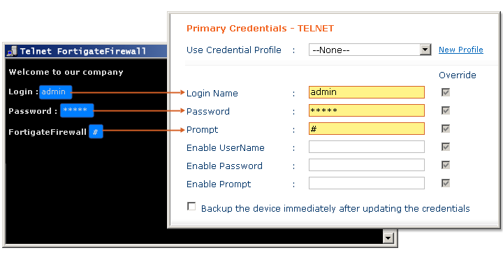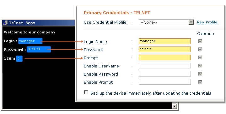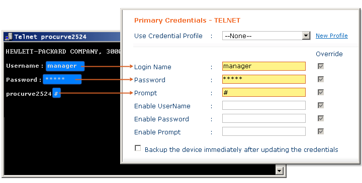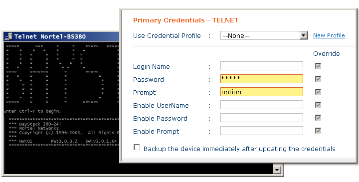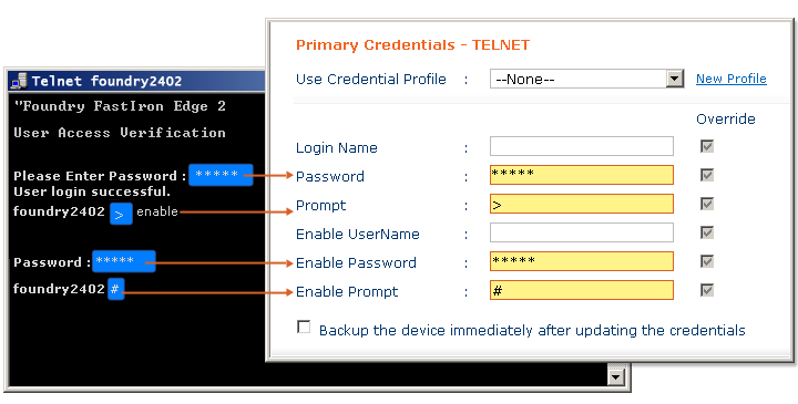 以下内容描述了怎样为设备输入凭证。为易于理解,阐述了当通过telnet控制台接入设备时,凭证式怎样输入的,并解释了怎样在DeviceExpert界面中输入。