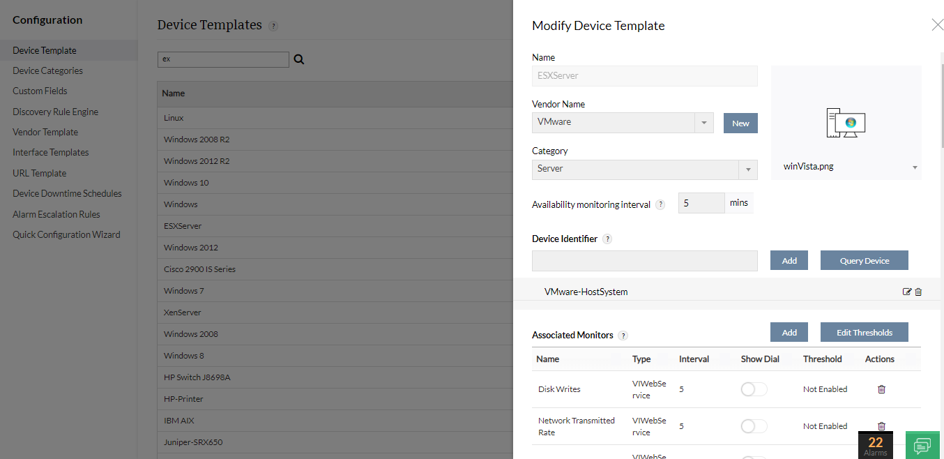OpManager提供了专门为ESX主机和VM量身定制的内置监控模板。这些模板简化了同时为多个 ESX 主机和虚拟机设置阈值的过程。每个性能指标都允许配置警告和错误阈值,确保在违规时触发主动告警。此功能简化了监控设置,使您能够毫不费力地高效管理 ESX 基础架构中的阈值。