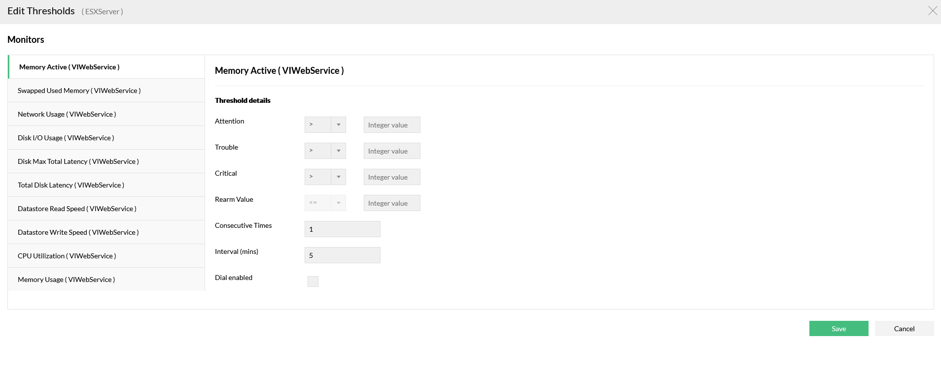 - 单击监视器名称以启用或禁用阈值,并修改警告阈值、错误阈值和重置值。