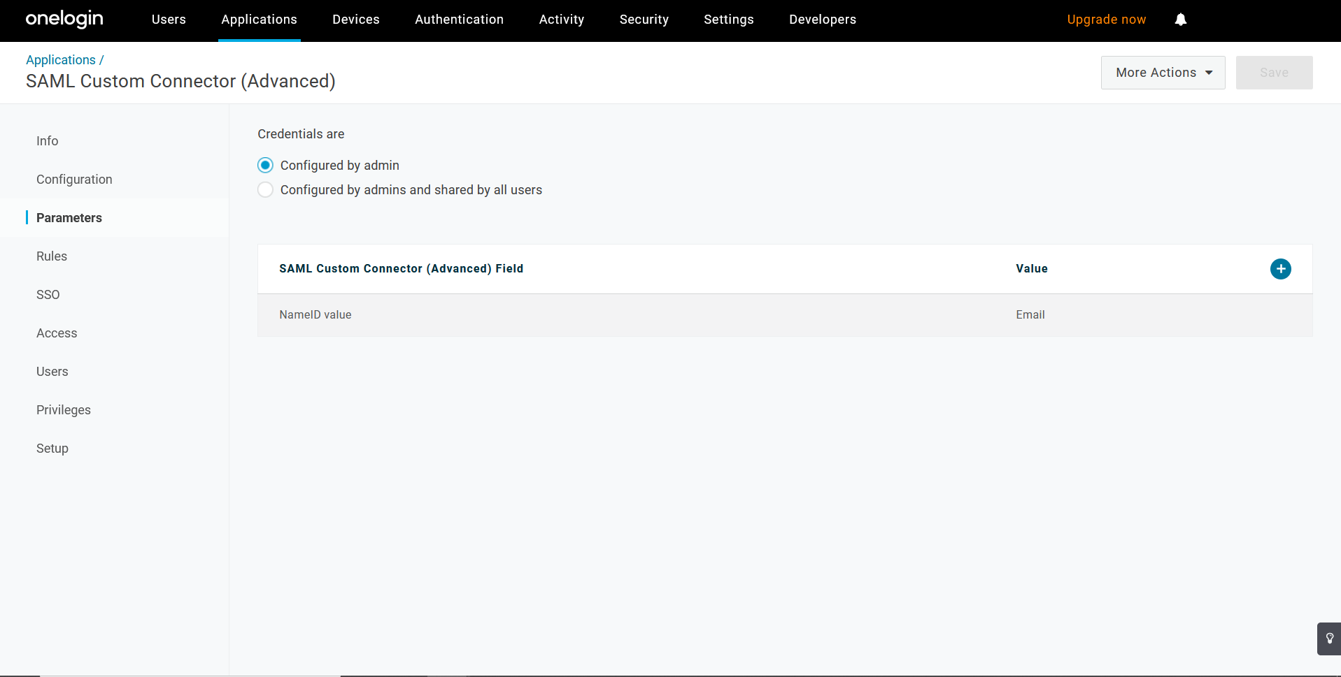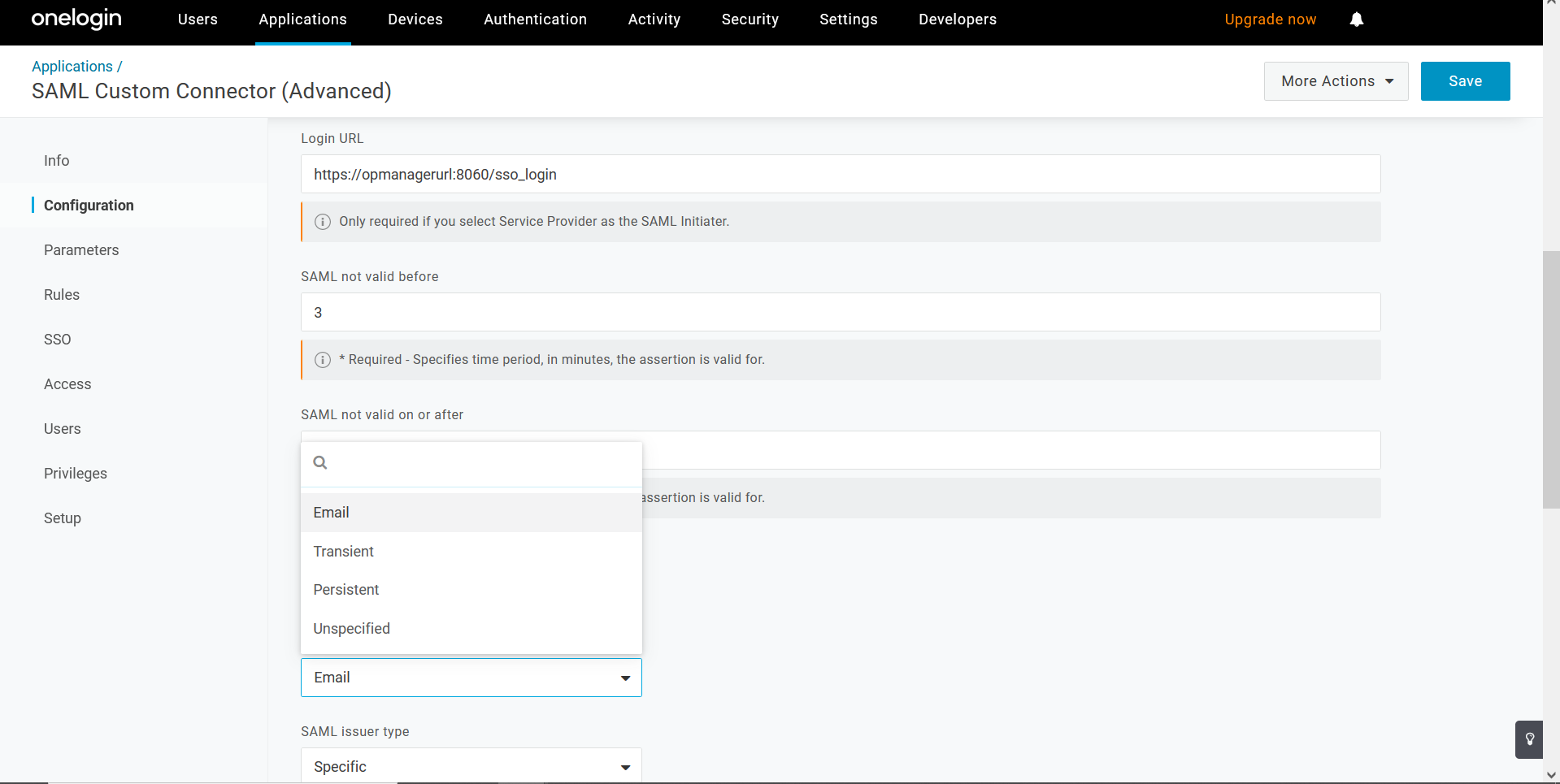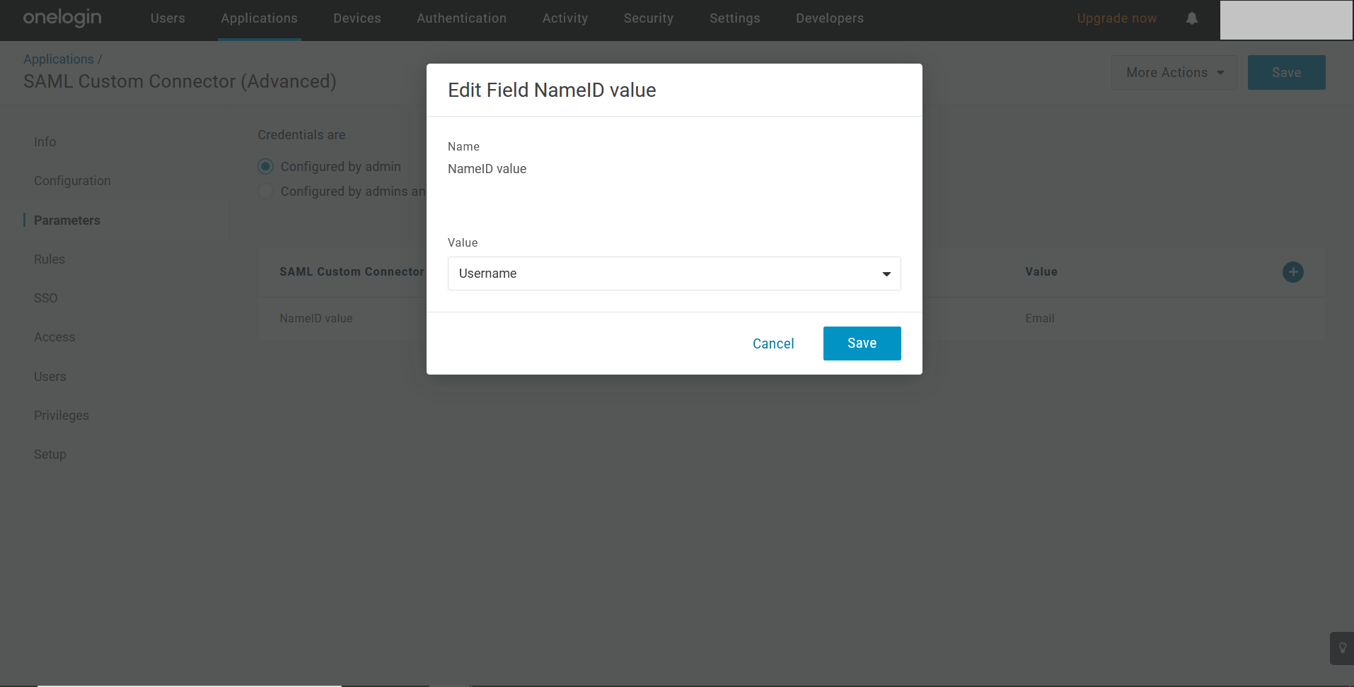 - 打开 Parameters 选项卡,然后选择管理配置选项。将字段 NameID 值编辑为 Username,然后单击保存。