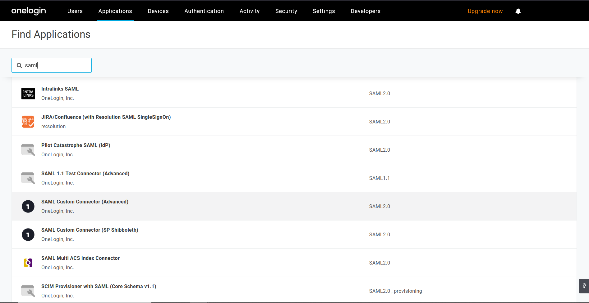 - 使用搜索栏并选择 SAML 自定义连接器(高级)。