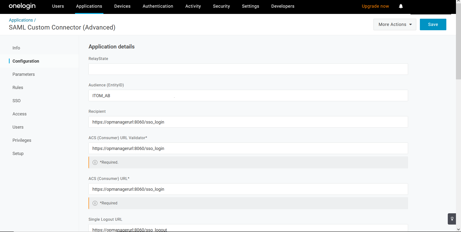 - 输入 ACS(消费者)URL 验证器和 ACS(消费者)URL(从 OpManager 复制)。选择保存。