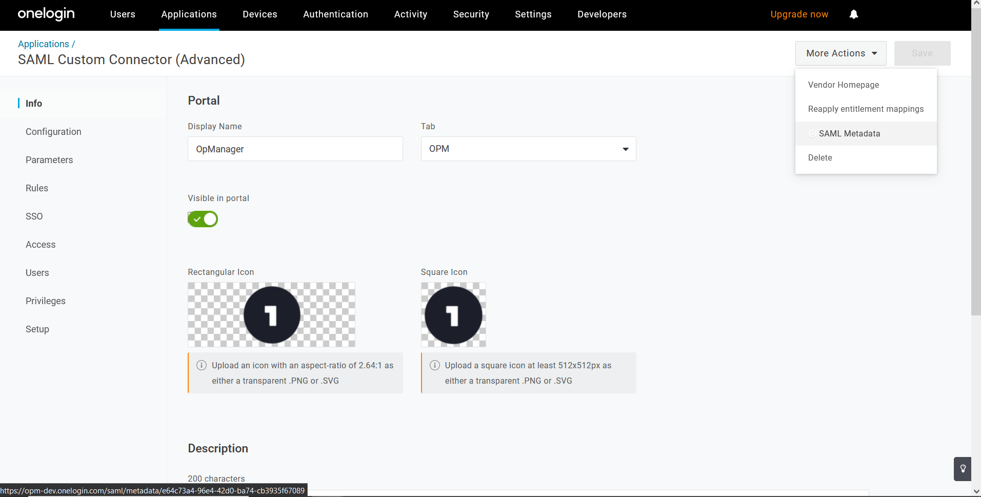 - 前往 信息 选项卡,然后单击右上角的 更多操作 下拉菜单。选择 SAML 元数据以下载元数据文件。