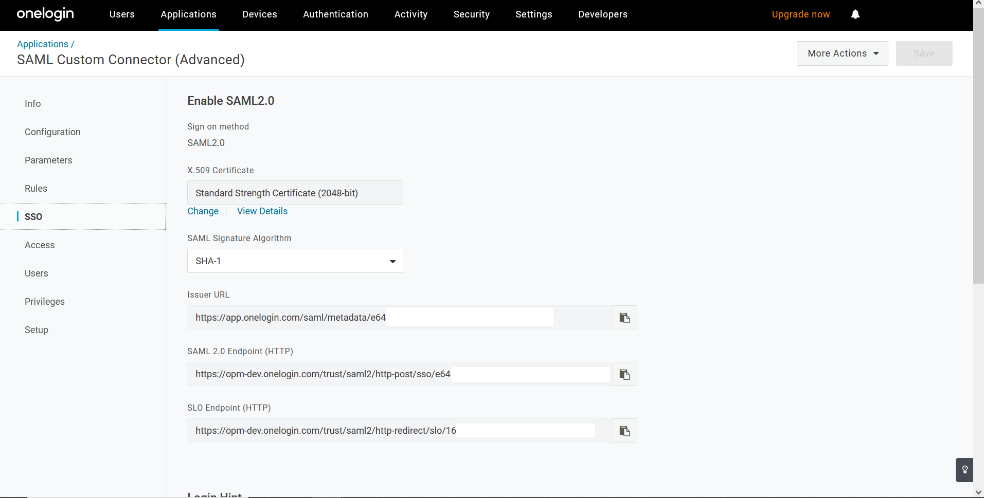 - 如果您希望手动启用 SAML,请返回 OneLogin 并导航到 SSO 选项卡。可以从此处复制所需的详细信息并粘贴到OpManager中。