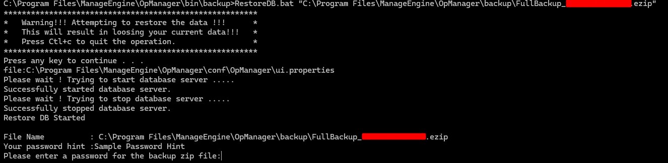 - 打开具有管理权限的命令提示符或具有 root 访问权限的终端,然后转到< OpManager Home>/bin/backup directory;