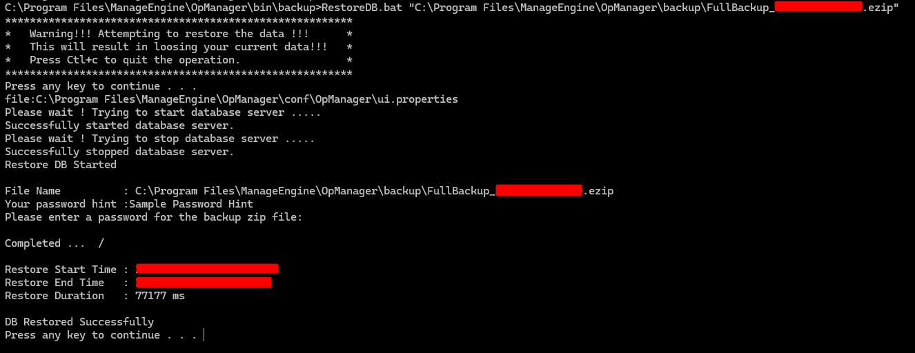 RestoreDB.bat <AbsolutePathOfBackupFile>。 示例: RestoreDB.bat "C:\backup\FullBackup_20230825031728.ezip"