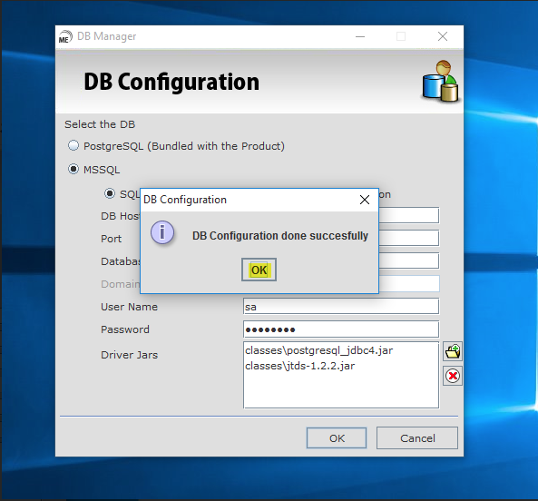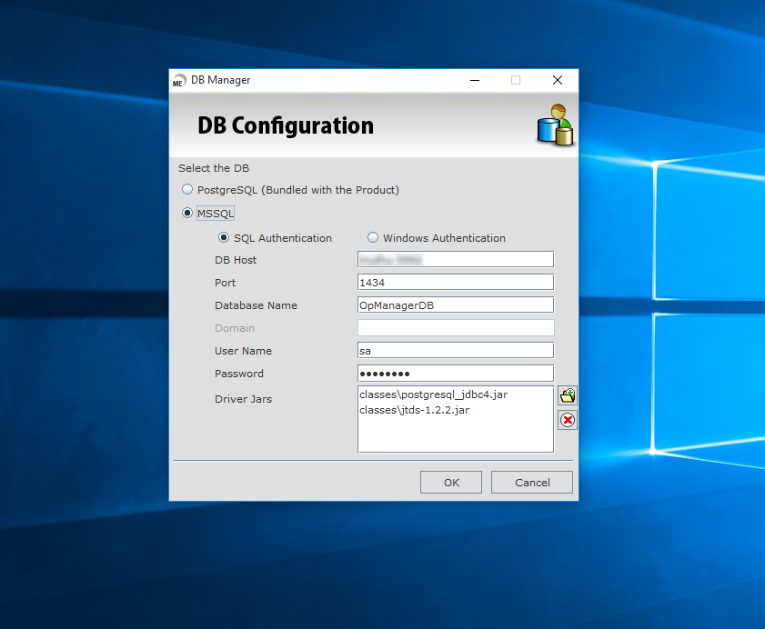 运行'DBConfiguration.bat'文件。将显示带有配置SQL服务器详细信息(DB主机、端口、数据库名称、域(如适用)、用户名和密码)的'DB Manager'窗口。