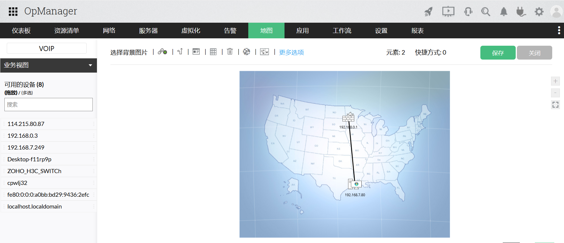 OpManager中的业务视图可帮助用户确保关键应用程序的可用性,并提供网络本身的图示。在VoIP监视器中,业务视图提供源设备和目标设备之间的呼叫路径详细信息,还帮助监视其可用性。每当创建新的VoIP监视器时,都会使用默认设置和背景自动创建业务视图(如下图所示)。但是,如果需要,用户可以修改背景和设备图标。