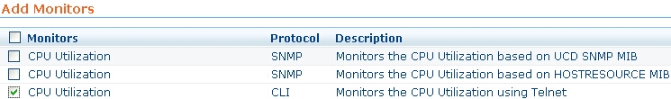 From the list of monitors displayed, select CPU Utilization which has the Protocol name as CLI against it and click OK.