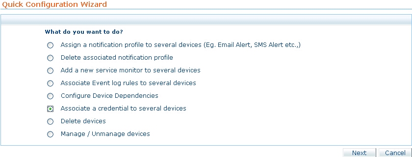 From the Quick Configuration Wizard, select Associate a credential to several devices. Click Next.