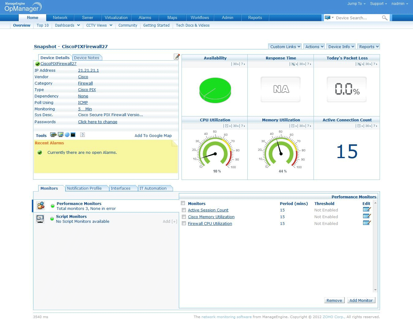 为了管理流量和防范安全威胁,管理员在防火墙等边缘设备上实施规则。有时,规则变得足够复杂,以致于延迟交通流,并最终导致资源的过度利用。OpManager观察利用率趋势,并允许设置防火墙运行状况异常警报。OpManager还支持对活动的VPN会话计数进行开箱即用的监视,从而允许识别负担沉重的防火墙。为了使决策更具决定性,OpManager与ManageEngine Firewall Analyzer集成,启用关于已用和未用规则的通知,以帮助确定已建立的防火墙规则。