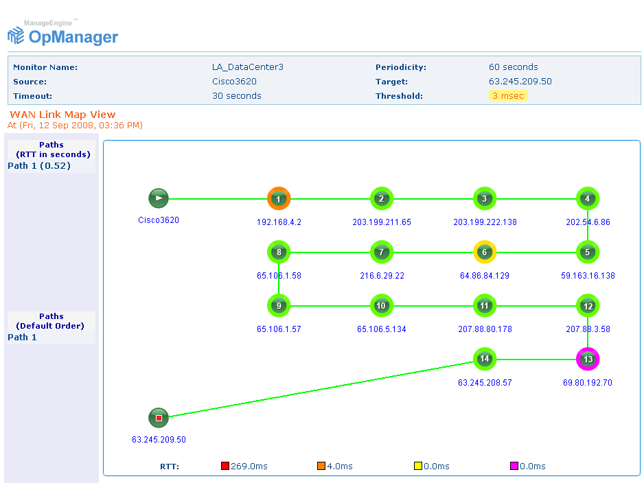由于您既无法控制也无法查看从ISP订阅的WAN链接,因此无法保证始终保持最佳网络速度。重要的是要对每个WAN链路都有可视性,以便降低性能瓶颈。OpManager通过利用Cisco强大的IP SLA技术,帮助可视化WAN链路,提供每个流量跃点的WAN链路可用性和延迟的跃点图和报告。您可以发现停机和巨大的延迟,然后与您的ISP协作,快速避免代价高昂的降级/停机。