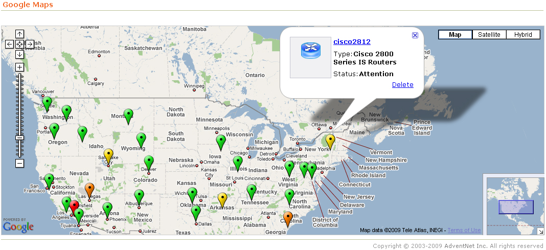 一位网络经理使用OpManager中的Google地图功能来监控他分布在美国48个分支机构的广域网。当其中一个站点变红时,他会在用户来电之前立即知道问题所在。单击此处查看