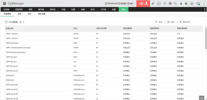 具体来说,OpManager 可能会考虑多种因素来生成预测报表,如存储设备的 I/OPS(每秒的输入/输出操作)、吞吐量、带宽,以及延迟、内存利用率、CPU 利用率等参数的历史变化情况。它不仅仅是简单地基于过去的数据进行线性推测,而是能够识别数据中的模式和趋势,以更准确地预测未来的需求变化。