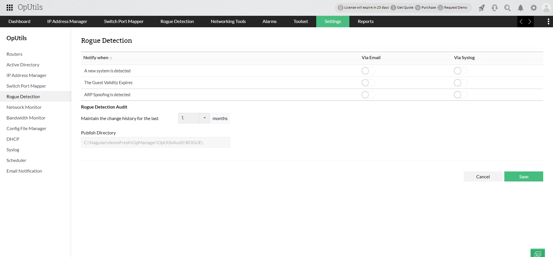 OpUtils的流氓检测系统会立即通知管理员任何未经授权的网络访问。通知可以通过电子邮件和/或播放声音。电子邮件通知可以对多人生效。当网络扫描仪识别网络中的入侵者。