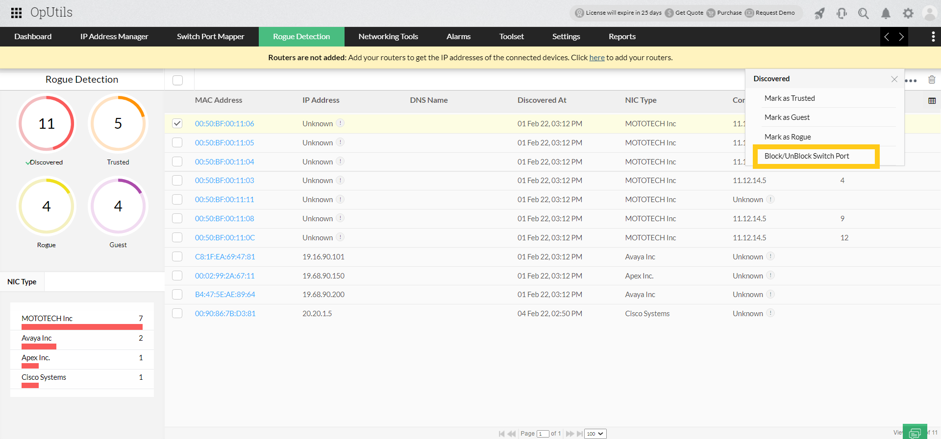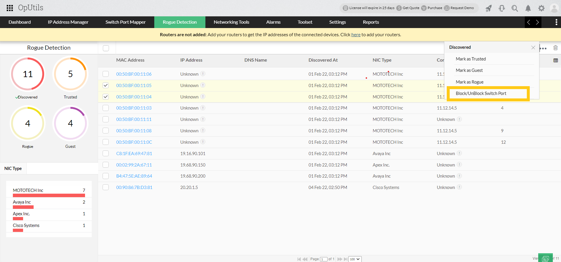 在恶意无线设备检测中,一旦检测到未经授权的访问,就会通知管理员。当与交换机端口映射相结合时,恶意设备检测网络还提供了恶意系统访问网络的交换机和端口的详细信息。交换机端口可以从OpUtils内部阻塞或解除阻塞。这使他们能够迅速采取行动阻止访问。