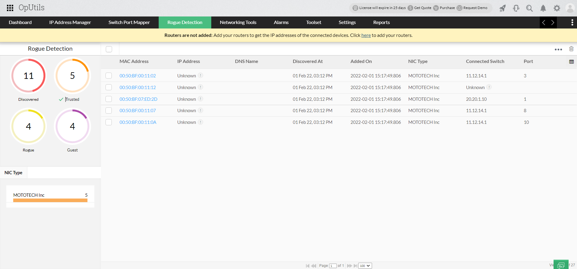 OpUtils定期扫描路由器和子网,以检测网络中发现的任何新系统/设备。最初,它列出了在网络中发现的所有系统/设备。管理员必须验证并标记网络中所有有效的系统/设备。在随后的扫描过程中,如果在网络中检测到任何新设备/系统,则会列出该设备/系统。这包括所有类型的设备,如台式机/笔记本电脑(有线)、移动用户(无线)、路由器、交换机等。