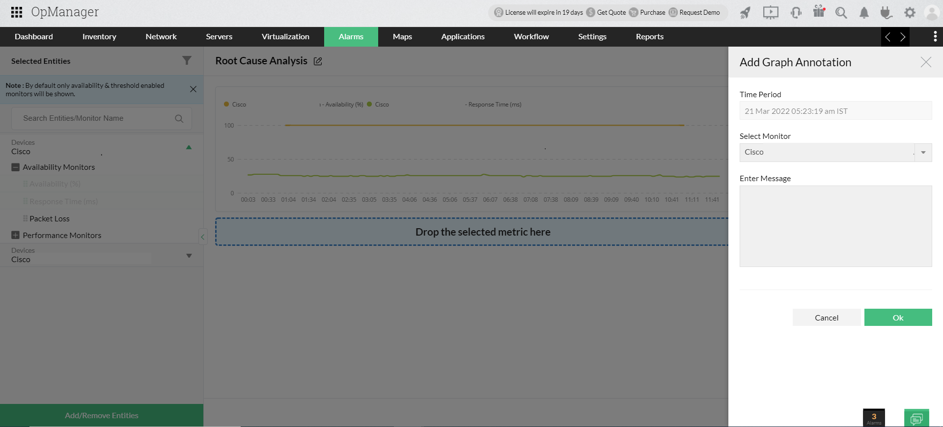 OpManager允许您对组执行RCA。例如,当某个分支机构发生网络中断时,您可以轻松地对分支机构(组)进行RCA,排查中断原因。