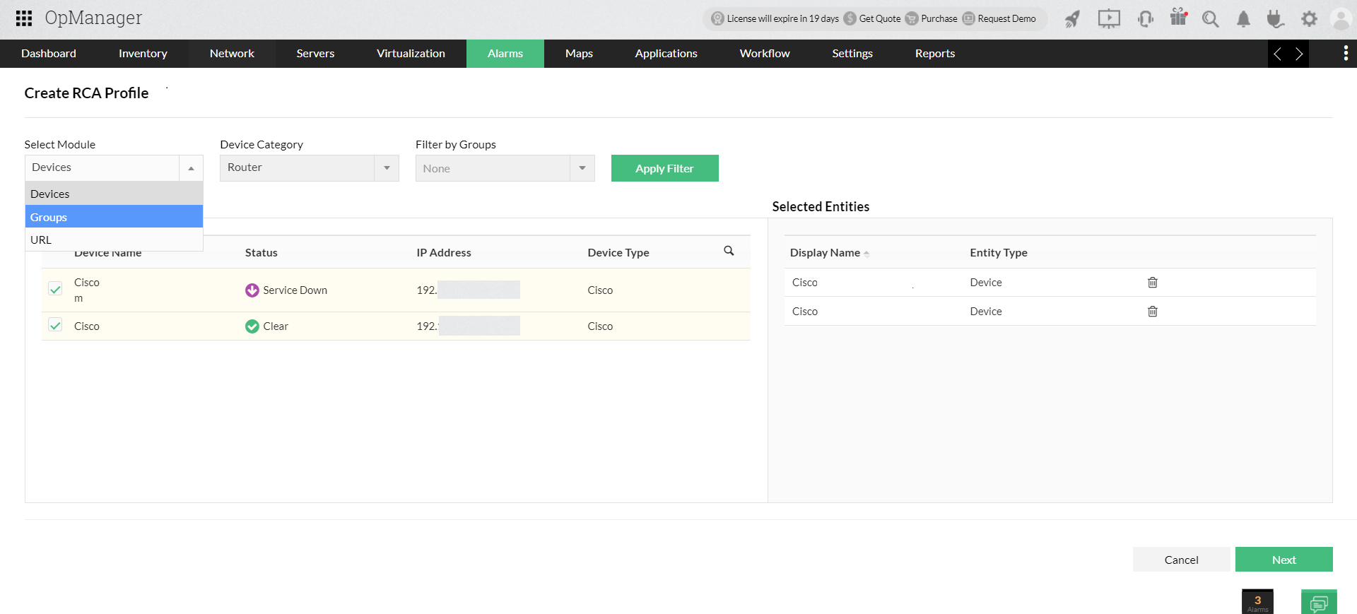 在创建RCA配置文件时,第一步是指定模块并选择实体。它支持三种不同的模块:设备、接口和URL。