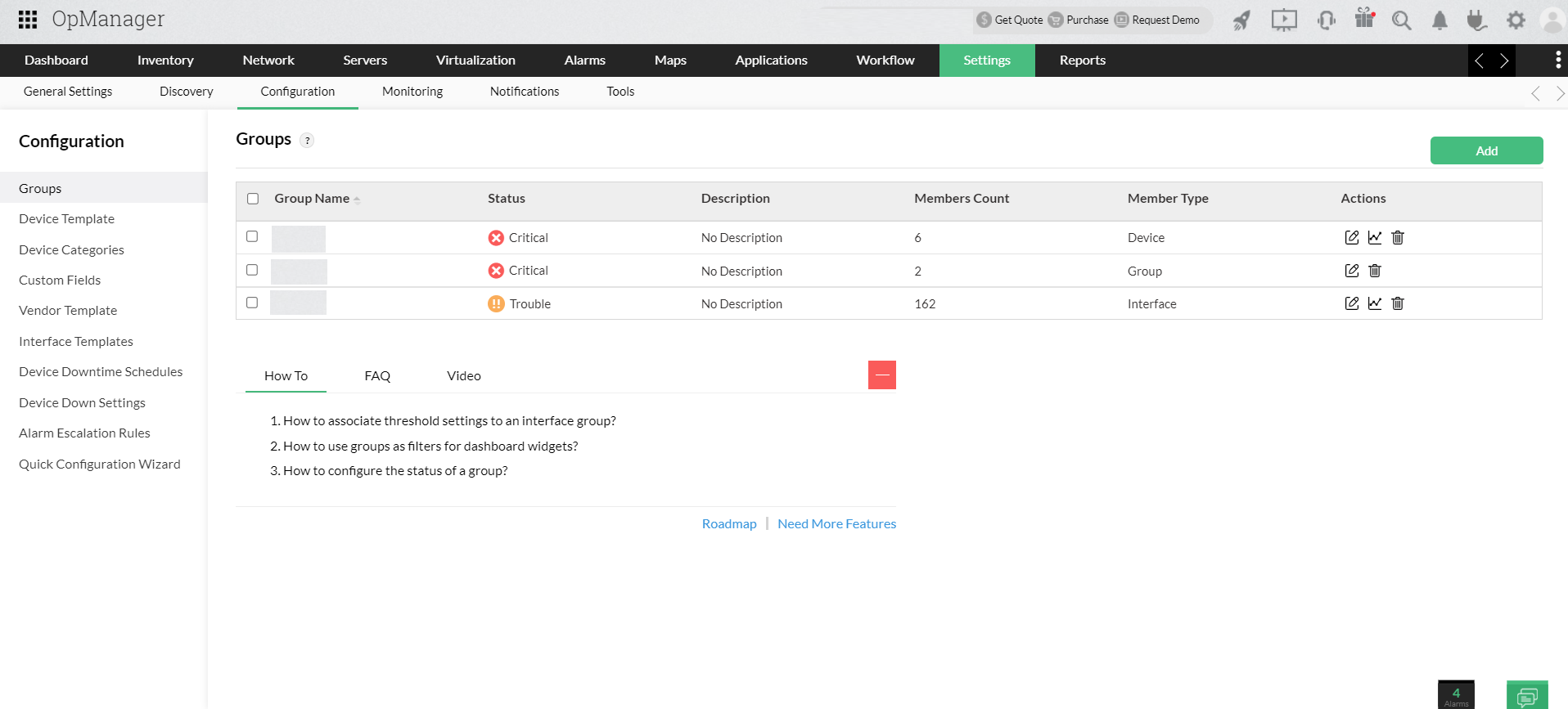 在OpManager中,您可以组合一组设备或接口,这样您就可以轻松地推送相应的批量配置变更。同时也可以根据任何标准形成组,例如您可以根据位置或类别针对设备形成一个组。