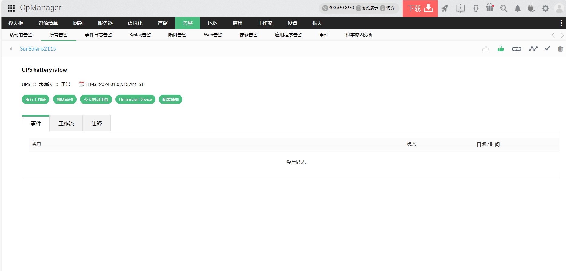 OpManager提供定制的实时警报和通知。您还可以为UPS监视器配置阈值,只接收您需要看到的警报。拥有一个主动的网络故障监控工具,如OpManager,可以帮助您确定任何UPS监控问题的根本原因,并在它影响网络正常运行时间之前修复它。所有发出的警报都用颜色编码,管理员可以查看与警报关联的事件历史记录。当警报发生时,OpManager的通知机制可以通过短信和/或电子邮件通知您。UPS监测跟踪电源管理并分析关键的电池管理状态,以控制网络的电源。