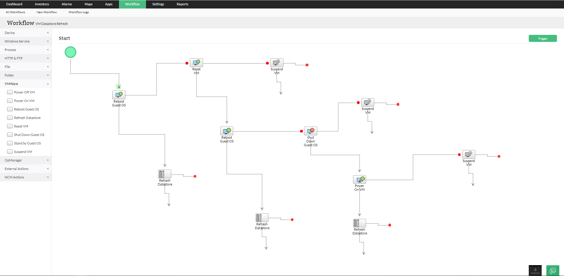 使用IT自动化工作流在VMware服务器上执行定期维护和故障修复任务。这将监视您的VMware服务器的事件,并将根据已配置的触发器配置文件自动执行工作流操作。
