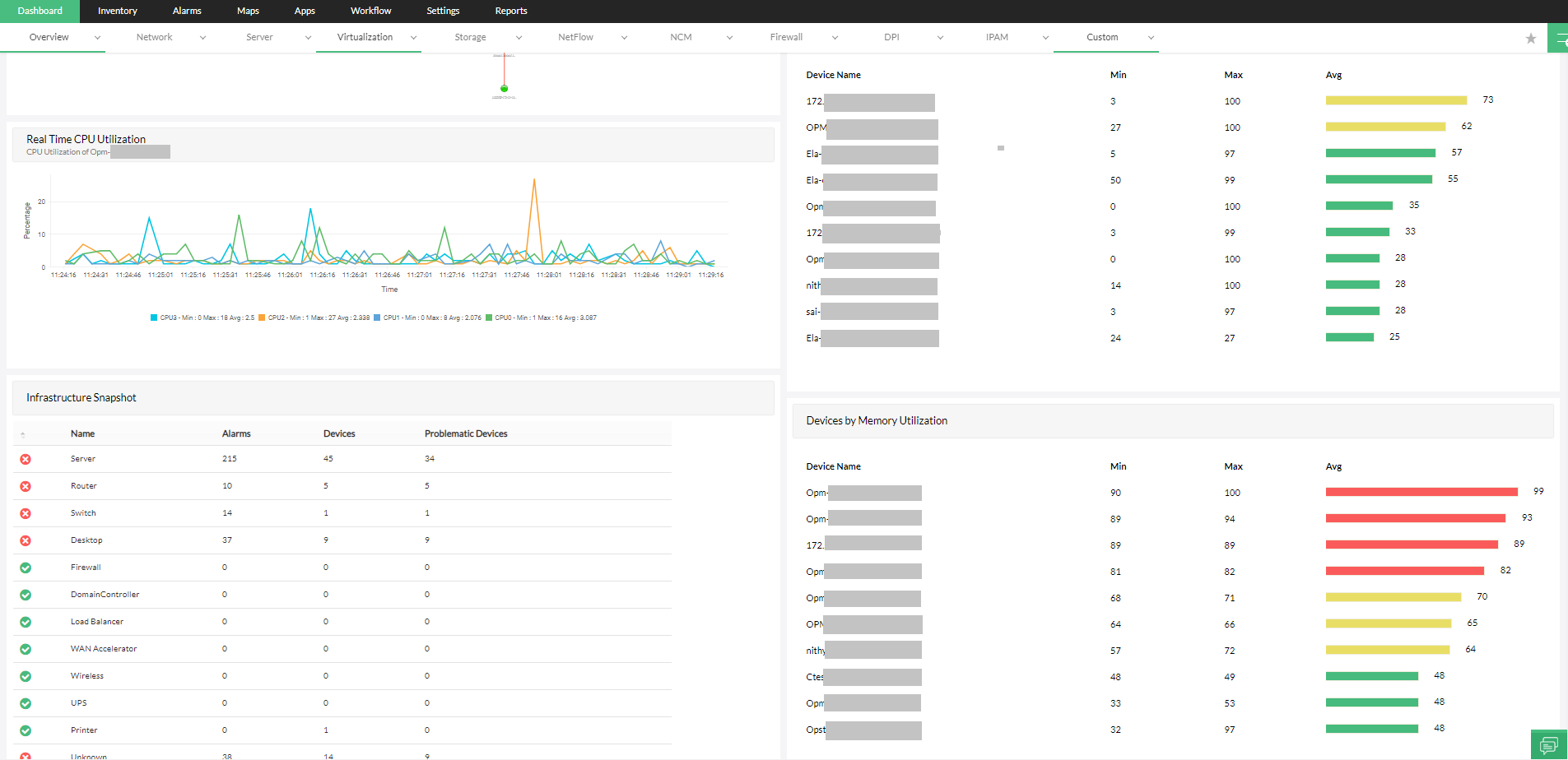 OpManager是一款虚拟管理软件,可为主机和VM提供70多种关于处理器、内存、磁盘和网络利用率的开箱即用报表。这些报表有助于确定利用率趋势、解决资源分配问题以及做出正确的容量增加决策。