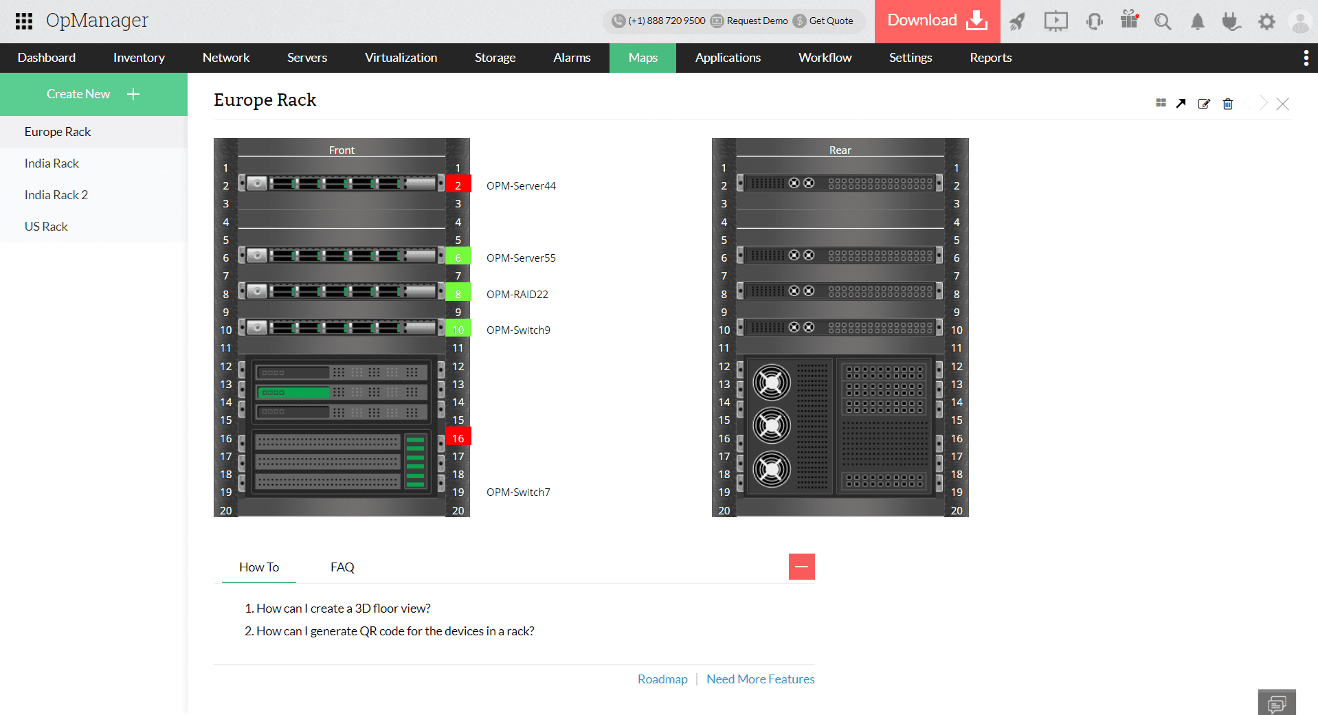 OpManager的3D地板和机架视图允许IT管理员查看其企业网络的物理布局。在3D楼层视图的帮助下,网络管理员在单一管理平台中可视化数据中心或服务器机房每一层的服务器和交换机。这使得定位服务器或交换机、查看其状态以及借助颜色代码识别故障服务器或交换机变得更加容易。在Rack View的帮助下,网络管理员可以查看服务器机架中的网络设备。这些网络设备可以通过在3D地板和机架视图中虚拟重新排列来优化。这种对网络架构的虚拟理解有助于您有效地组织和管理数据中心。OpManager还提供了所有网络设备状态的颜色编码表示。这有助于网络管理员快速识别问题并解决问题。