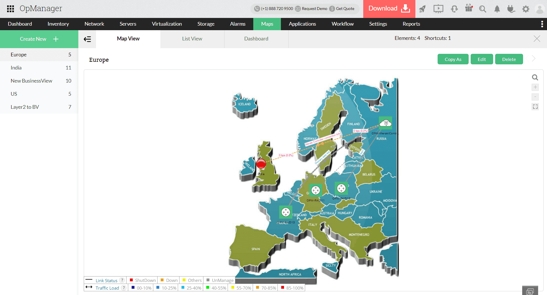 通过OpManager的业务级映射,IT管理员可以根据设备所提供的业务服务获得设备的图形化表示。IT管理员可以通过在设备之间添加链路来创建网络级依赖关系,然后可以根据用户或组织的需求配置这些链接,管理员还可以添加地图来表示数据中心所在的地理位置。业务级映射确保业务关键型应用程序始终可用,并有助于更快地进行故障排除。