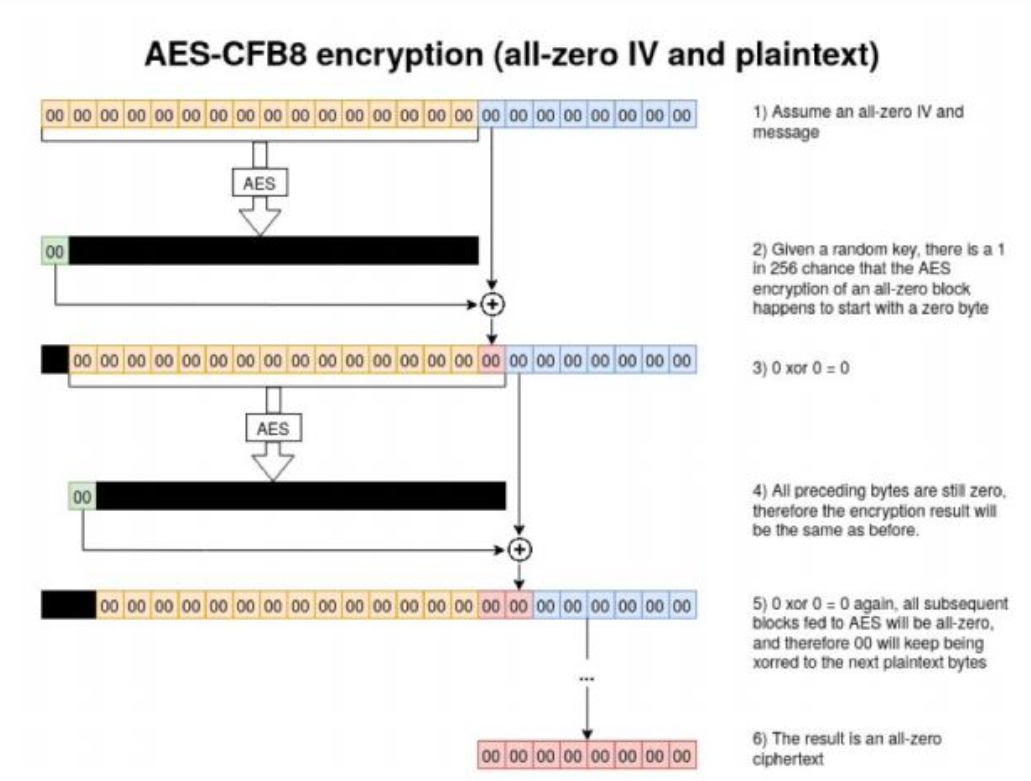 全零IV会出什么问题? 256个密钥中有一个,就会应用AES-CFB8加密然后导致全零密文。