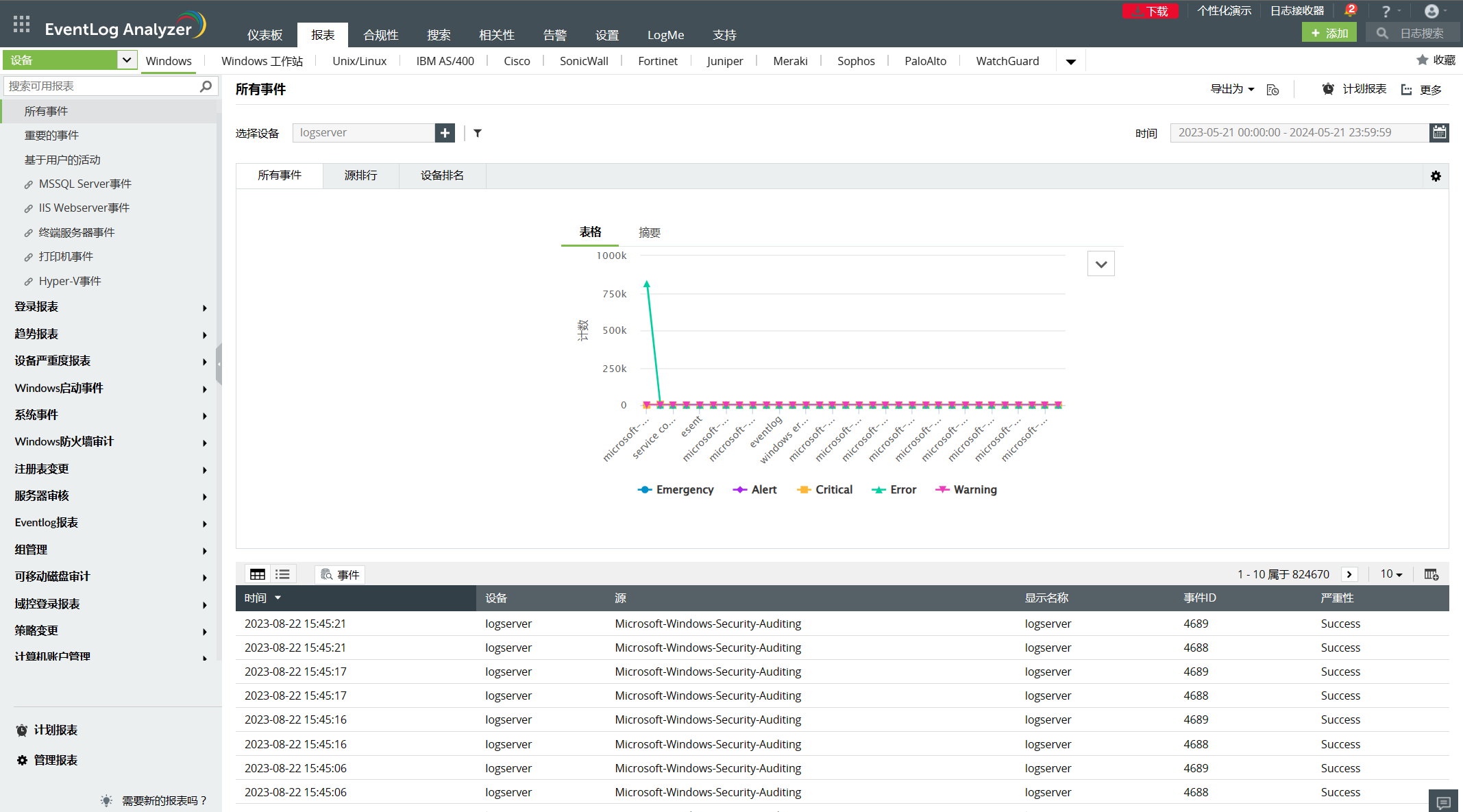 EventLog Analyzer是一款全方位的SIEM日志分析解决方案,通过一个集中的平台来对日志进行收集、分析、报表、查询和归档。该软件帮助减少内部威胁、进行日志取证分析、监视特权用户以及满足各种法律法规的合规性要求,生成各种各样的报表,例如:用户活动性报表、合规性报表、历史趋势报表以及其他报表。