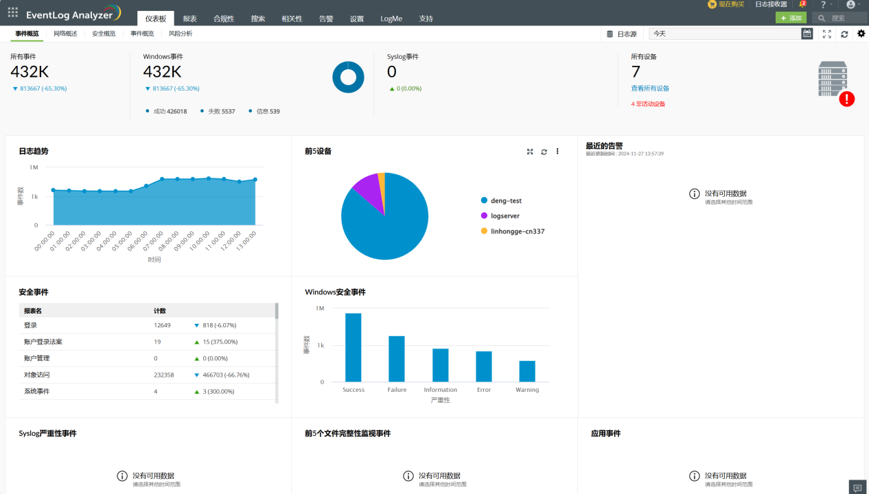 事件日志监控系统提供实时的可视化和分析,帮助识别潜在的安全问题、检测异常、排除故障,并确保 IT 基础设施中所有相关设备的整体安全性和性能。