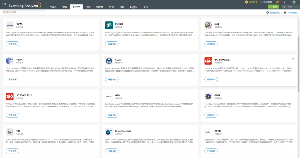 它包含了许多行业特定的法规和标准,如PCI DSS或GDPR,要求收集、保留和保护日志数据。EventLog Analyzer提供了预定义的合规性报告,确保您的组织符合这些要求,帮助内部和外部审计流程。
