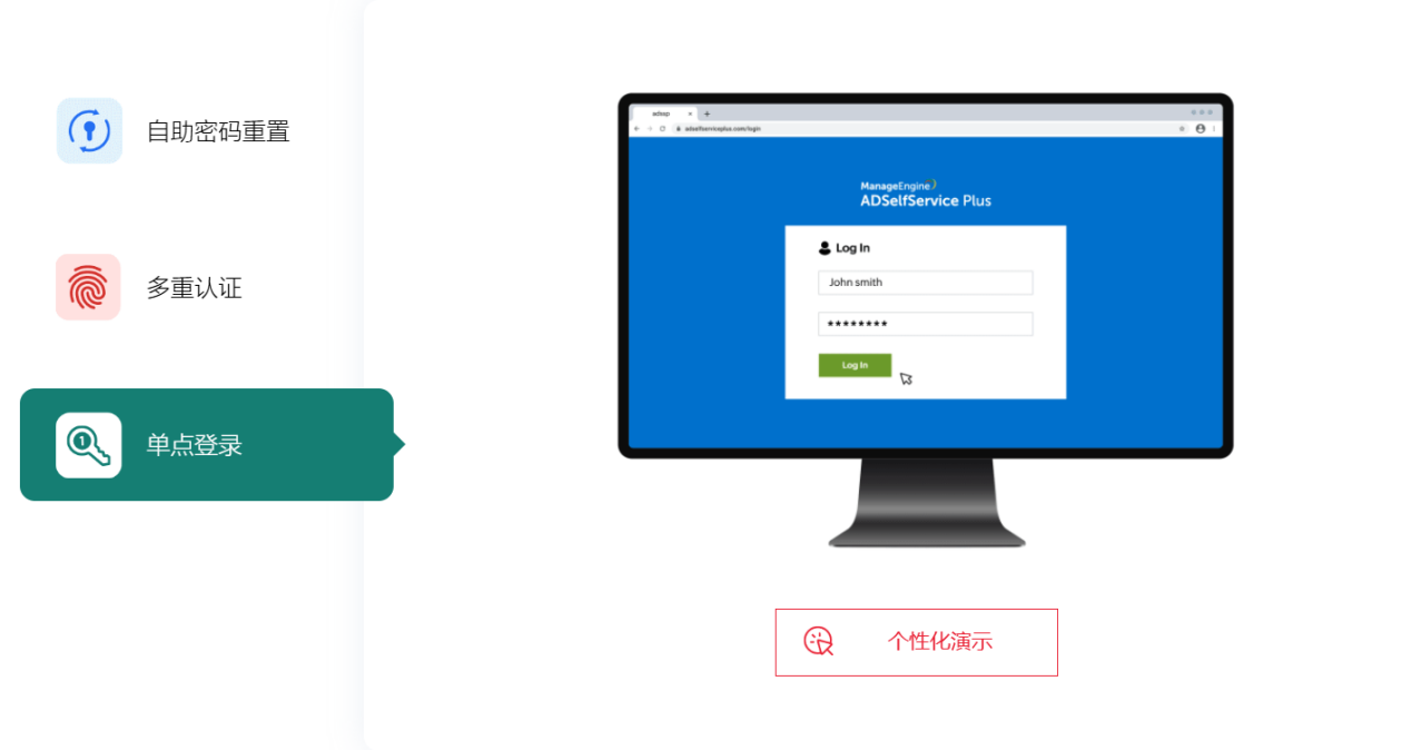 ADSelfService Plus是一个集成的Active Directory自助密码管理和SSO解决方案。它通过 SSO 简化并增强了用户的登录体验,并使用 MFA 提供更高的安全性。