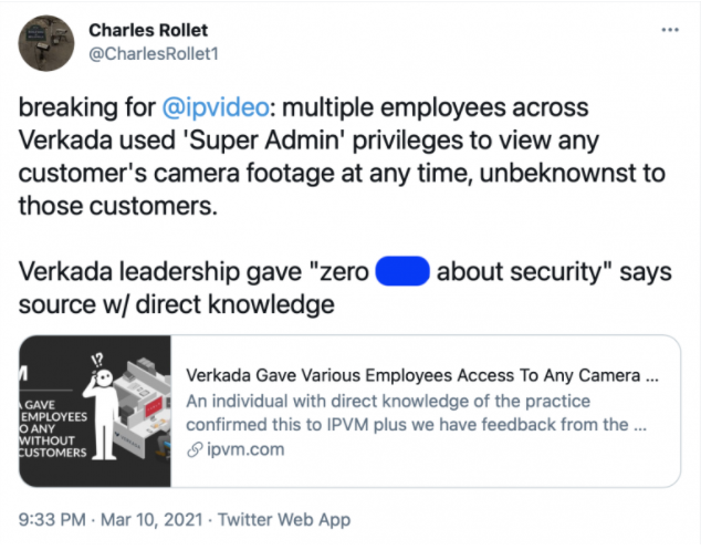 如这次在Verkada遭到攻击之后,公司才发现Verkada内几乎每个团队成员都具有Super Admin特权,几乎Verkada所有员工直接拥有窥视用户的特权。