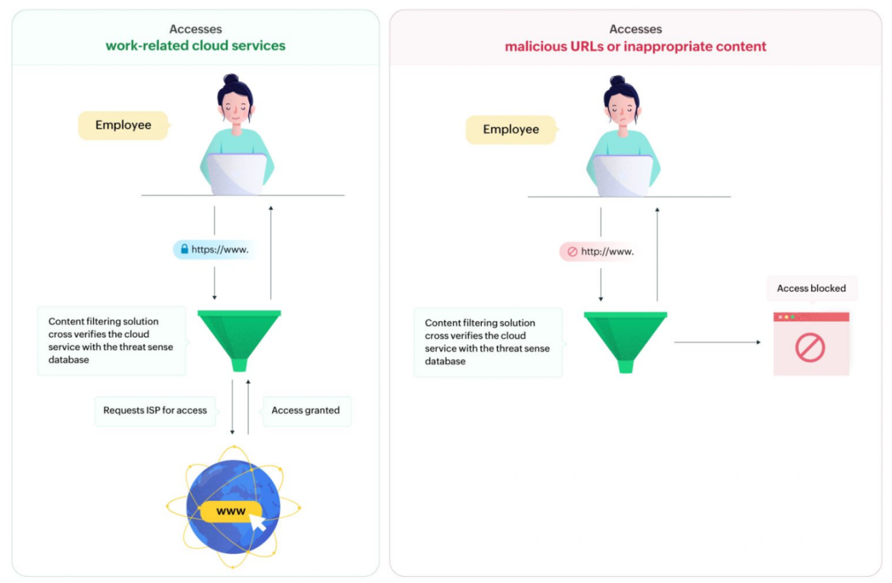 URL 过滤(也称为内容过滤或 Web 过滤)限制员工访问不安全的 Web 内容,例如网络钓鱼和恶意软件页面。它使用基于历史记录、年龄、底层 URL 等分配给每个云应用程序的信誉评分来授予或拒绝访问权限。