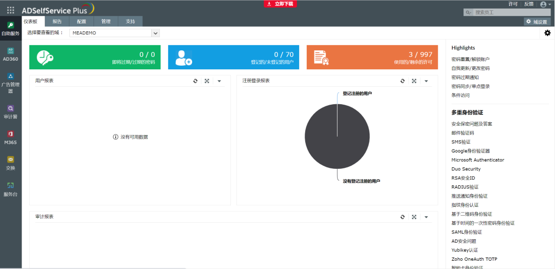 ADSelfService Plus是一款专业的AD自助服务密码管理和单点登录解决方案。它提供了密码自助服务、密码过期提醒、自助目录更新、多平台密码同步以及云应用程序的单点登录服务。ADSelfService Plus大大减少了IT管理员的工作量,提高了员工的工作效率。