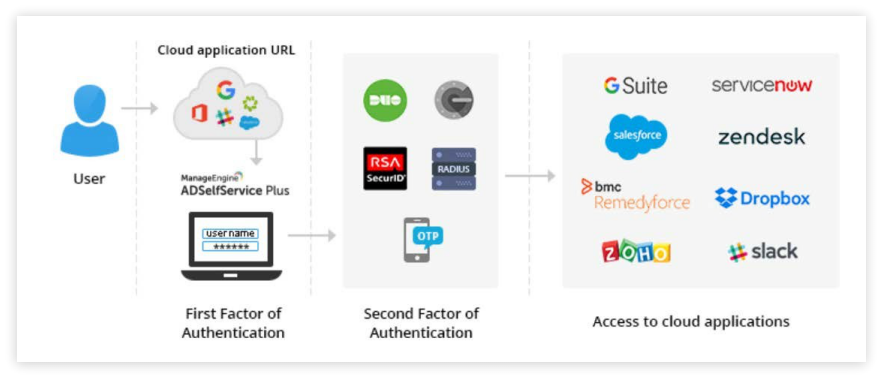 虽然检测攻击可能很困难,但是可以通过设置多重身份验证(mfa) 将危害降到最低。ADSelfService Plus为超过100个企业应用程序以及企业中任何基于SAML 2.0的应用程序提供多重身份认证和单点登录。IT管理员还可以根据用户的OU和AD中的组成员关系为每个用户配置应用程序单点登录。