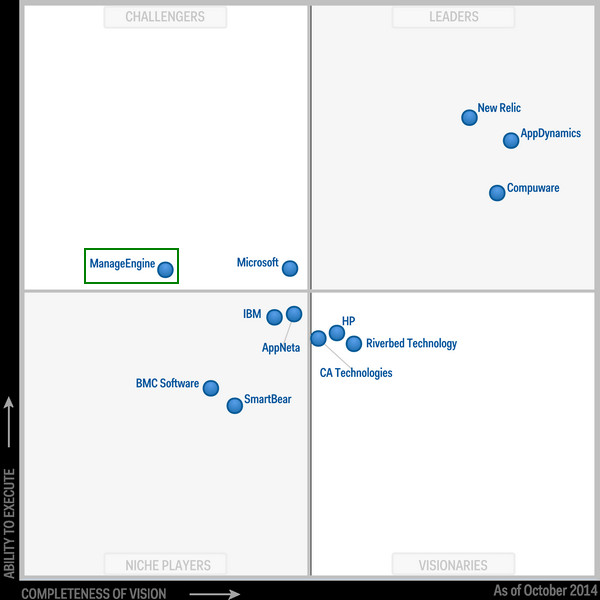 2014年10月28日,全球领先的信息技术研究与咨询公司Gartner公布了2014年应用性能监控魔力象限报告(Magic Quadrant for Application Performance Monitoring),根据不同厂商的执行能力和发展前景的完备性对全球12家主流的应用性能监控产品供应商进行了评估。基于Gartner的独立分析,厂商被划分为领导者(Leader)、挑战者(Challengers)、特定领域者(NichePlayers)和远见卓识者(Visionaries)四个象限。