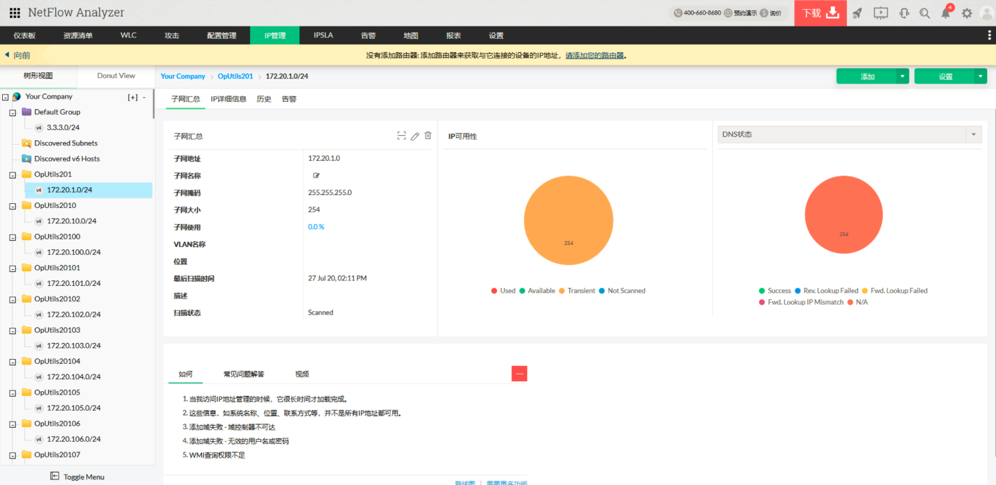 IP地址管理:通过全面了解其IP地址,例如IP历史记录,可用性和已分配状态,来分析网络中的IP使用情况。IPAM SPM插件为您提供了跟踪IP地址空间的详细信息,向您展示了子网级IP地址的可用性,DNS解析详细信息,与Active Directory的集成以及被监视IP地址引发的告警精。