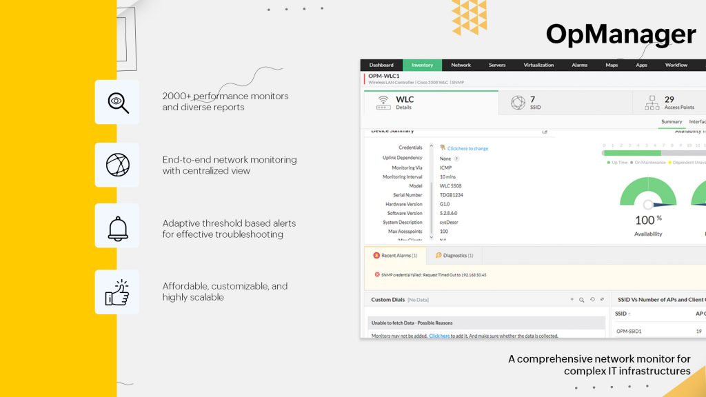 值得注意的是,WiFi 网络容易出现可能中断可用性的不良麻烦,例如网络过载。这使得部署提供可靠网络正常运行时间监控的 WiFi 监控解决方案变得非常重要。有效的企业级 WiFi 监控解决方案,例如 ManageEngine OpManager,可以出色地完成这项任务。它提供网络可用性监控,与网络性能监控协同工作,以主动确保网络持续正常运行。通过使网络管理员能够集中查看所有关键网络组件的可用性和状态,OpManager 还支持不同的监控器来自动跟踪可用性和性能指标。这有助于确保不间断的网络可用性。