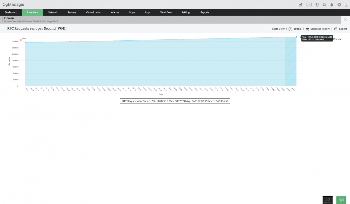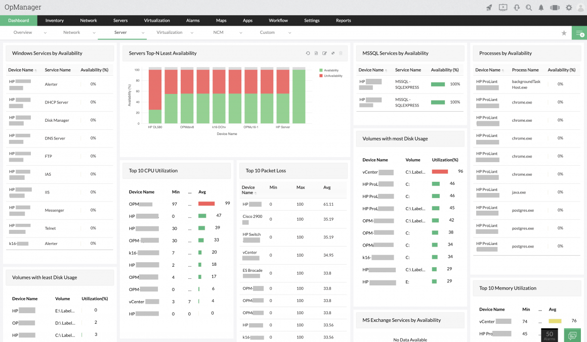 OpManager通过高度可定制的仪表板提供了Windows设备状态的整体视图。可以使用显示在仪表板上的自定义窗口小部件查看所有关键指标。网络操作中心控制台中可以显示几个仪表板,以提供整个网络的鸟瞰图。
