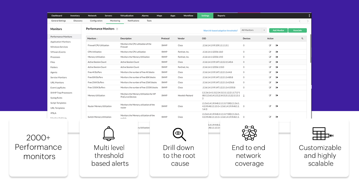 正在寻找有效的网络监控解决方案来简化 IT 运营管理并提高性能?试用 OpManager — 一个完整的网络性能监控解决方案,使您能够深入了解网络资源。这种可靠的网络监控解决方案提供: