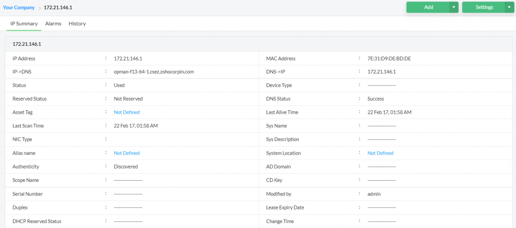 使用 OpUtils 的 IP 地址跟踪器,可以深入了解 IP 关联的 MAC 及其属性。它向显示 MAC 的设备数据,例如设备类型、NIC 类型、资产标签、连接的交换机和端口详细信息。还可以深入了解系统名称、描述和位置等详细信息。IP 地址跟踪器还跟踪 IP 的网络方面,例如其地址解析状态、AD 域、保留状态和真实性。这有助于分析 IP 是如何被使用的以及由谁使用。