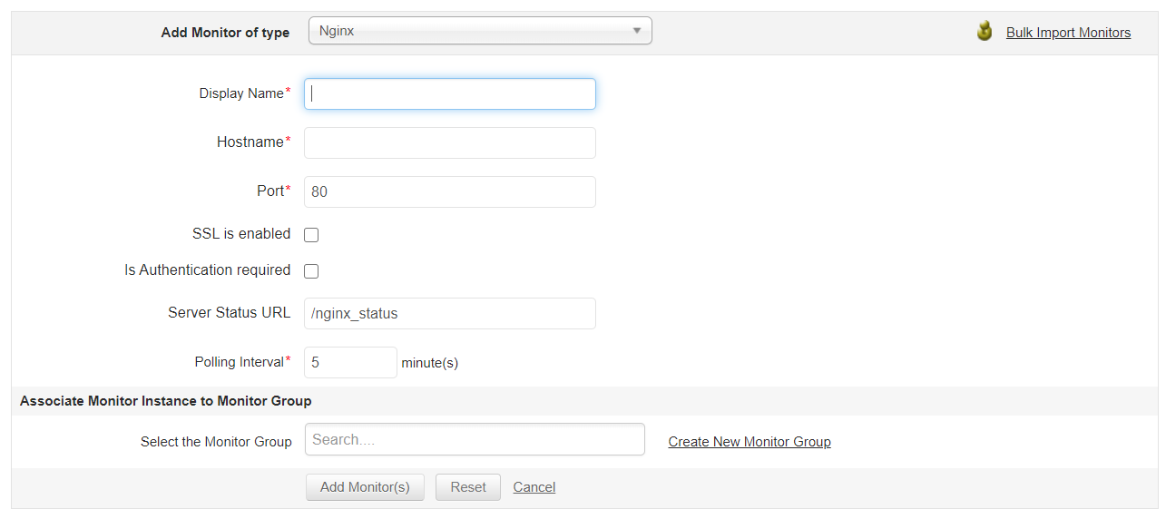使用Applications Manager,可以轻松设置对Nginx服务器的监控。您所需要做的就是填写“显示名称”,“主机名”,“服务器状态URL”和“轮询间隔”之类的字段,然后根据需要启用/禁用某些选项。