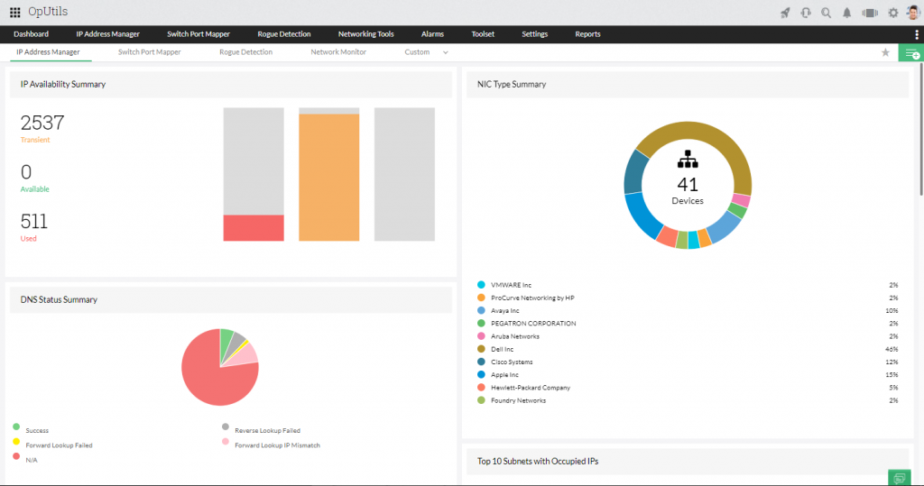 管理大型网络要求您跨子网跟踪IP地址,以解决IP地址冲突之类的问题。OpUtils的高级IP扫描程序工具支持IPv4和IPv6地址的基于子网的敏捷层次结构。它通过IP可用性,DNS状态,真实性状态和AD状态等指标提供对子网性能和利用率的可见性。您可以通过在子网中启动IP扫描来监视子网中的IP地址,并在几秒钟内获得结果。