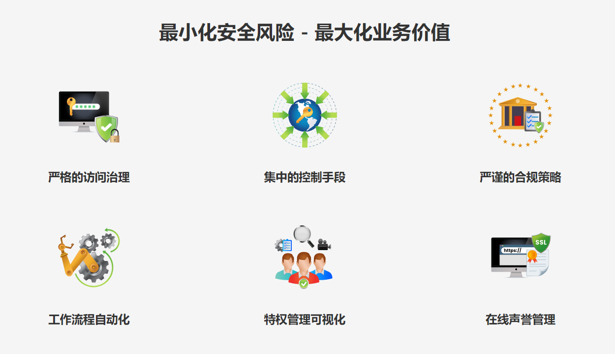发现并识别在IT基础架构中散布的所有特权账户、密钥、证书和敏感文档,将它们统一存放在一个中心位置。围绕谁可以访问它们,以及访问多长时间,来设置权限和策略。通过这种方式,构建对关键数据所有权访问的可见性和控制,尤其是针对长期被遗忘或废弃的特权账户,避免为恶意行为人员提供高风险的后门。