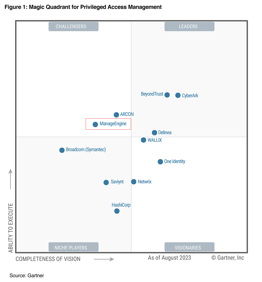 公司的完整愿景和执行力得到认可,这是ManageEngine五年来第四次获得特权访问管理魔力象限的认可,在魔力象限中被评为挑战者,它与10家PAM供应商一起接受了评估,以考察其愿景的完整性和执行力。