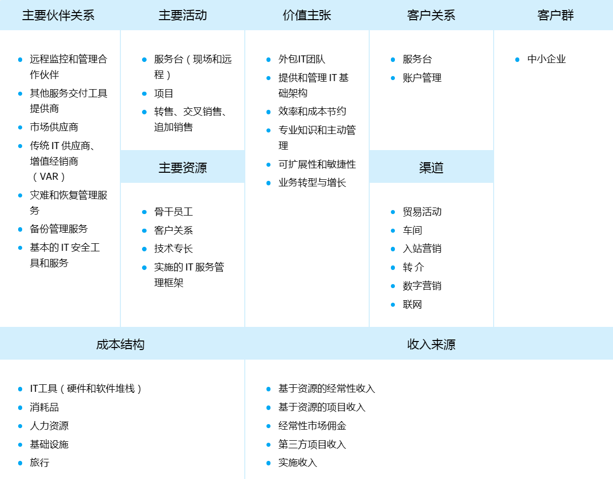 商业模式画布是一个非常重要的工具,可以直观地表示商业模式的关键组成部分。对于初出茅庐的 MSP 来说,商业模式画布尤为重要,因为它提供了一个框架来创建可用于吸引投资者和客户的综合商业计划。